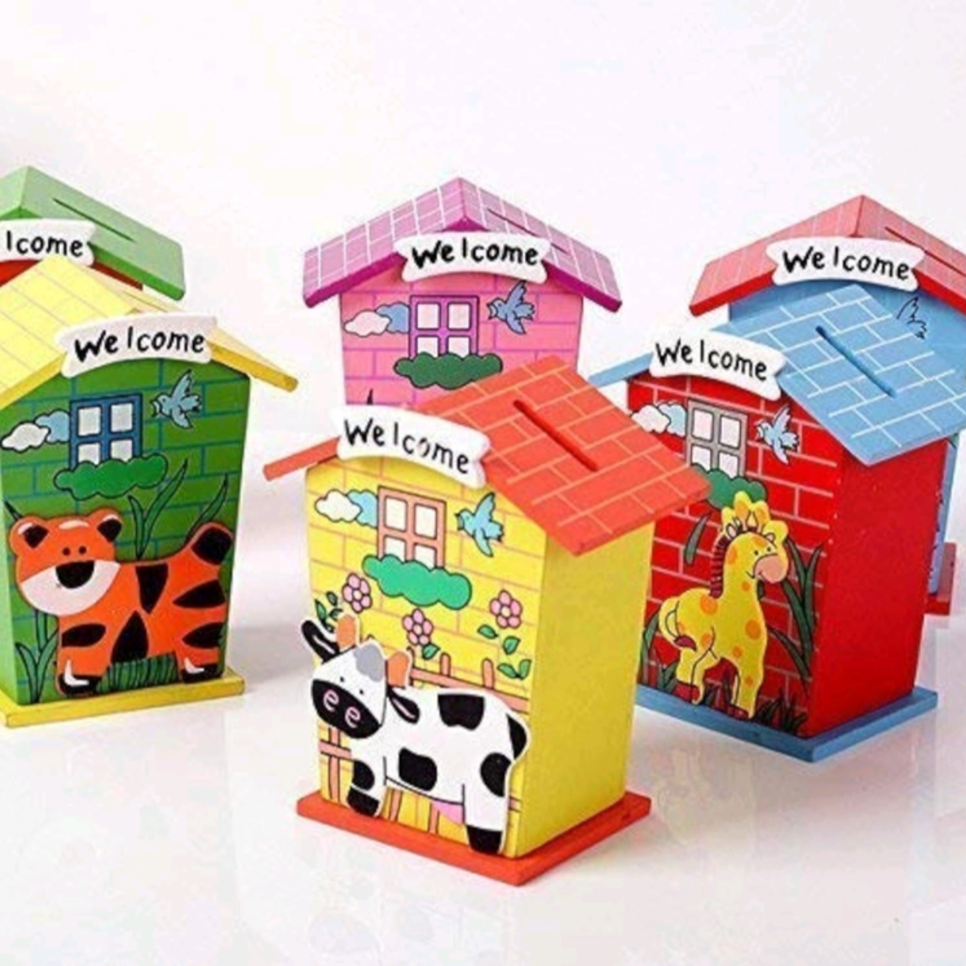 Encourage saving habits in your child with these Colorful Wooden Animal Coin Banks shaped like cheerful houses! Each piggy bank features a cute animal (turtle, tiger, elephant, etc.) and a vibrant, multicolored design that kids will love.