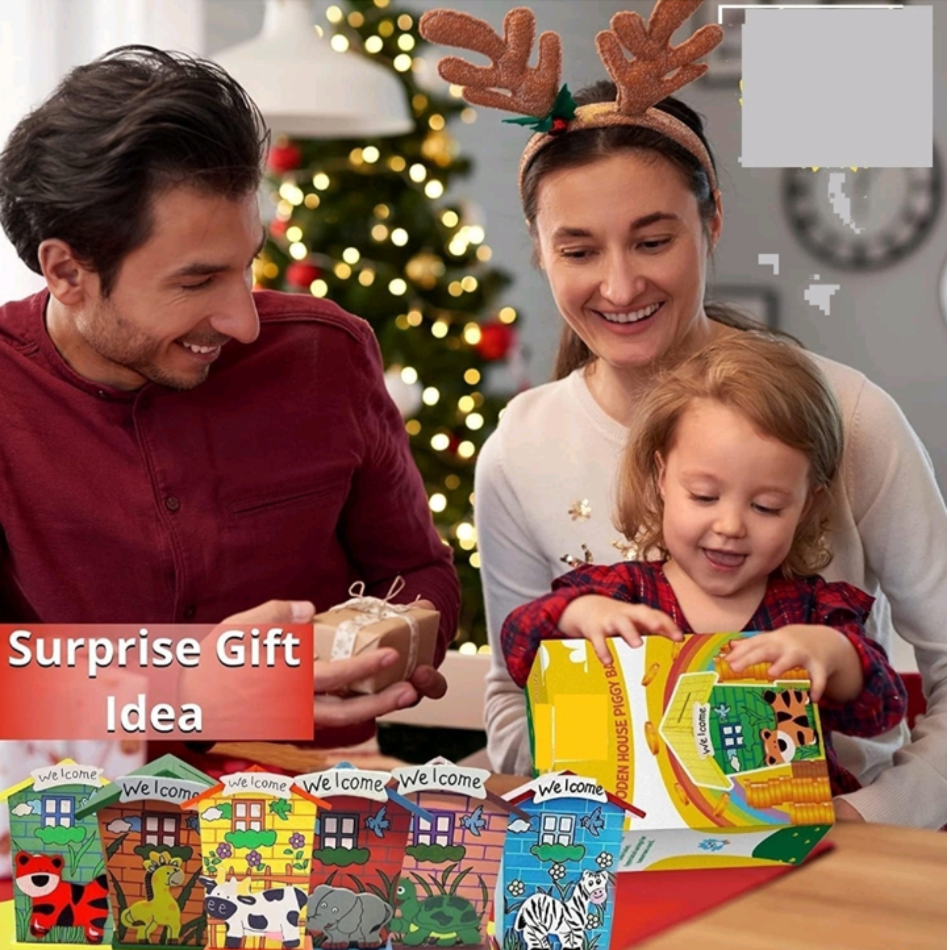 🏠 House-shaped design with a “Welcome” sign and cartoon animal illustrations