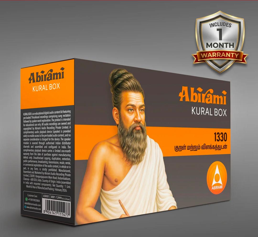 This Kural box plays 1330 Thirukkurals continuously with their Tamil meaning. Each Kural is recited twice and its meaning is recited once, making it very easy to understand.