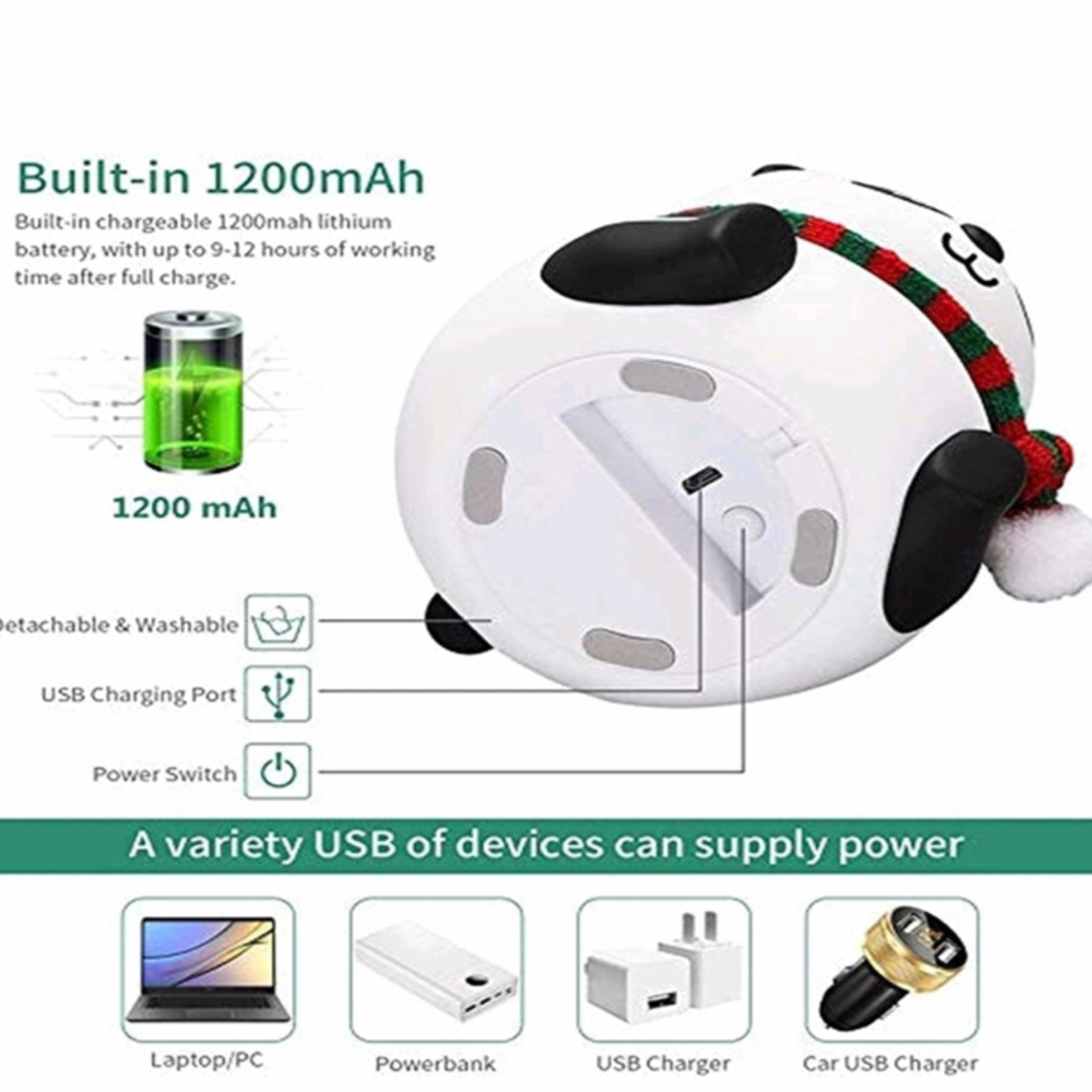 Cute and cuddly in design, this Panda Night Lamp is perfect for children and adults alike. It comes with a built-in 1200mAh rechargeable lithium battery, offering 9–12 hours of continuous light after a full charge. The soft silicone body is detachable and washable, making it hygienic and easy to maintain. It features a USB charging port, power switch, and is compatible with laptops, power banks, USB wall chargers, and car USB chargers. Ideal as a night companion or décor piece for bedrooms and nurseries.